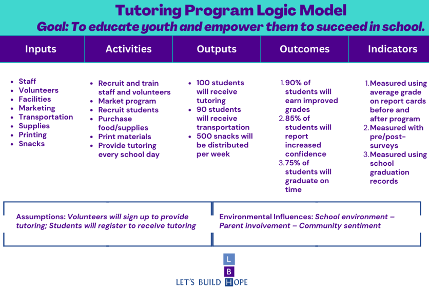 Program design: I like to use a logic model to examine a program as a whole and evaluate whether the planned activities will produce the desired results. I ask myself: if my goal is to educate youth and empower them to succeed in school, is it reasonable for me to think that tutoring will result in that outcome? Are there other factors that I should consider and add into my program design? For example, in our fictional tutoring program, the logic model might have helped me realize that I need to add transportation to ensure that students can access the program.